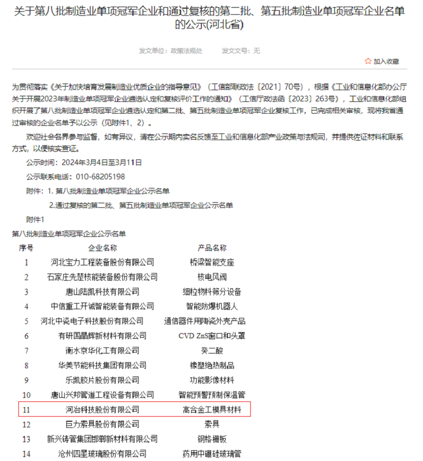 根據(jù)《工業(yè)和信息化部辦公廳關(guān)于開展2023年制造業(yè)單項(xiàng)冠軍企業(yè)遴選認(rèn)定和復(fù)核評(píng)價(jià)工作的通知》(工信廳政法函〔2023〕263號(hào)),工業(yè)和信息化部組織開展了第八批制造業(yè)單項(xiàng)冠軍企業(yè)遴選認(rèn)定和第二批、第五批制造業(yè)單項(xiàng)冠軍企業(yè)復(fù)核工作,已完成相關(guān)審核,河冶科技股份有限公司被認(rèn)定為第八批制造業(yè)單項(xiàng)冠軍企業(yè)。